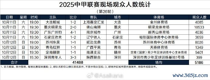 2025中甲联赛现场不雅世东说念主数统计(第26轮)