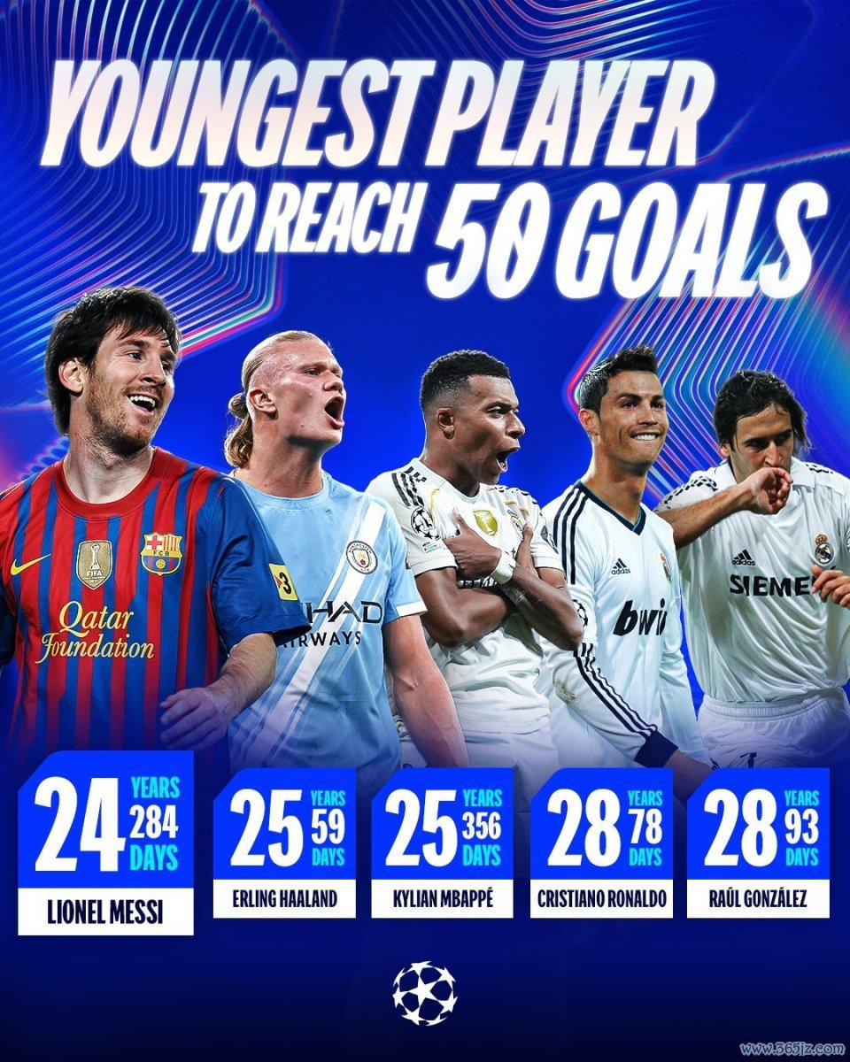 近日,欧冠官方公布了欧冠最快50球的名次,梅西以24岁284天的年岁成为欧冠史上最年青50球先生。