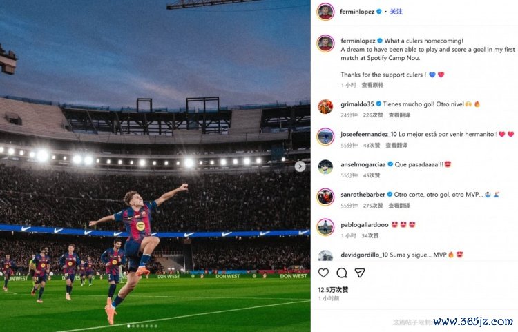 费尔明也在赛后通过社媒晒出我方的豪情庆祝照,并配文:“何等精彩的巴萨回家之战!能在诺坎普球场出场并进球,险些像作念梦雷同!感谢巴萨球迷的复旧!”